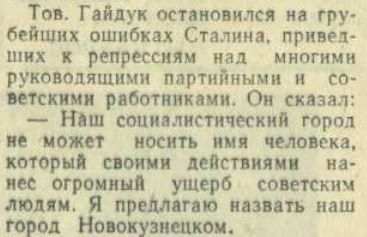 «Выступавшие товарищи и все собравшиеся единодушно одобрили решения съезда… о ликвидации последствий культа личности… Коллектив института… горячо поддержал предложения трудящихся о переименовании нашего города в Новокузнецк».